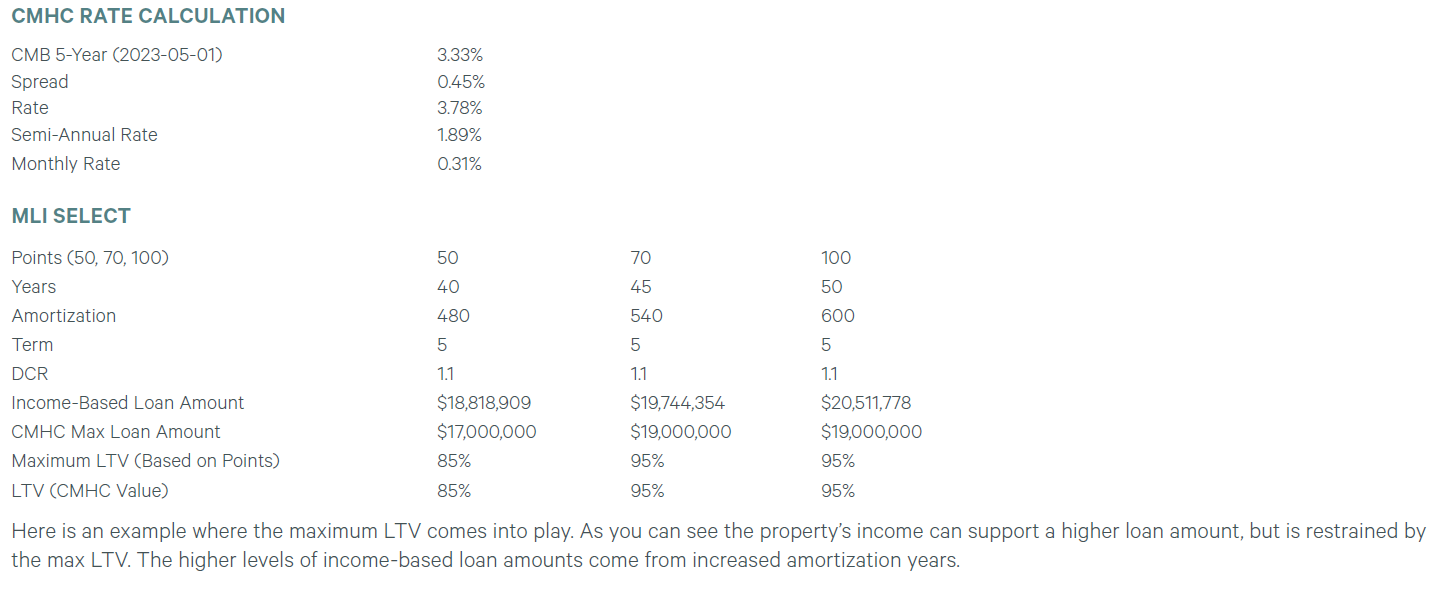 The actual interest rate for the loan is the rate that will impact your monthly payments and this rate can be different from the underwriting rate for two reasons. The first reason is that the underlying bonds are constantly moving. Most competitive CMHC-approved lenders are CMB* based, but some are cost-of-funds (COF)-based and these underlying rates move between the time you get your COI to the funding date or interest-lock date. Most lenders have interest-rate hedging mechanisms to fix the rate in advance and the hedge costs vary from lender to lender. Hedge costs are typically added to the interest rate. Secondly, the lender’s profit (spread) above the underlying bond might be tighter or wider depending on the specifics of the loan such as the size of the loan and the borrower’s experience. Generally, for larger loans, lenders can reduce the spread while smaller loans might require a larger spread – this is due to scale. Lenders will also bid more aggressively for strong borrowers with solid property management experience. Lenders are also able to reduce their spreads on MLI Select loans that have a component of affordability.